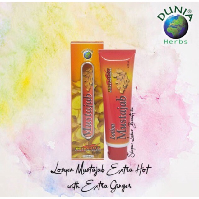 Losyen mustajab super hot dunia herbs. Digunakan di seluruh badan untuk membakar lemak dan melangsingkan badan. Losyen untuk bakar lemak & bersukan. Telah menjadi identiti losyen keluaran syarikat dunia herbs, losyen mustajab pati halia extra hot juga tidak melekit dan cepat menyerap tanpa meninggalkan kesan minyak. The lotion lime&ginger,super hot with capsicum,extra hot with extra ginger,ginger extract, losyen mustajab original and lotion mustajab super hot 130ml (1 hari pos) + free bubble wrap are among the bestselling products from dunia herbs malaysia.